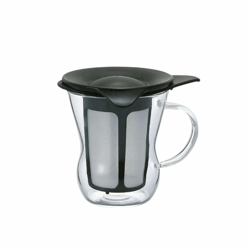 Taza de té con filtro. Al voltear la tapa, se convierte en una bandeja para el colador de té después de su uso.